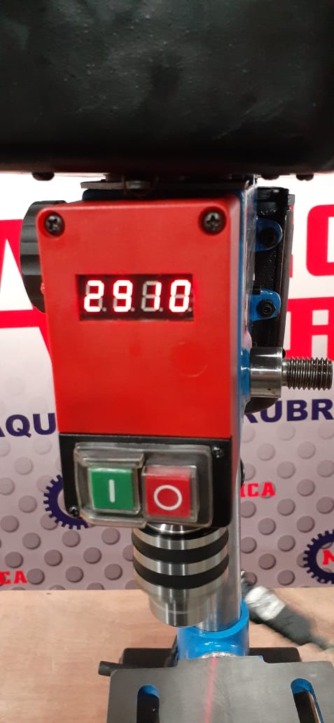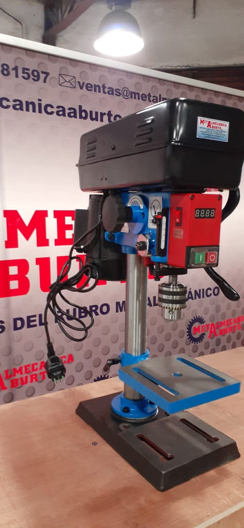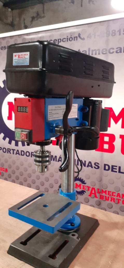 TALADRO CON VELOCIDAD VARIABLE ELECTRÓNICA, MANDRIL DE 1/2", RPM DIGITAL, PUNTERO CRUZ LÁSER, VELOCIDAD DE 500 A 2000 RPM. MOTOR MONOFÁSICO DE 450 WATTS. MESA DE 165X165MM. CARRERA 140MM. CONO MORSE # 2, DISTANCIA LIBRE ENTRE EJE Y COLUMNA 114MM. DIÁMETRO DE LA COLUMNA 48MM.